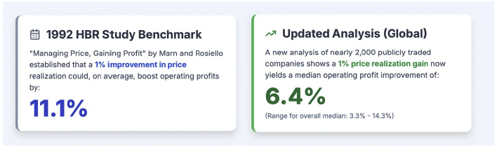 For decades, leaders repeated the classic benchmark that a 1% price gain yields an 11.1% operating profit improvement. Revology Analytics revisited that question using contemporary data from approximately 2,000 public companies and found that pricing still produces one of the most dependable profit impacts. However, the median operating profit lift from a 1% net price realization improvement is about 6.4% across industries.2025 Revenue Growth Analytics M…