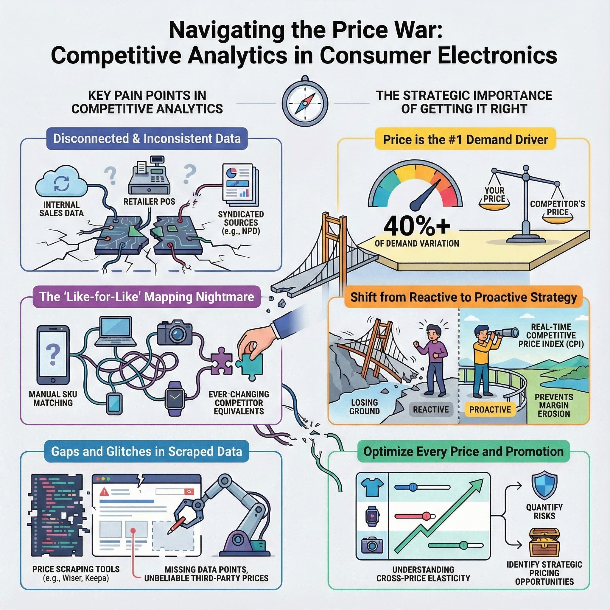 A global consumer electronics company found its competitor tracking to be manual, reactive, and fragmented. Sales teams manually checked major retailers, and key metrics, such as the Competitive Price Index (CPI), resided in hard-to-update spreadsheets, which were challenging to align with market share.